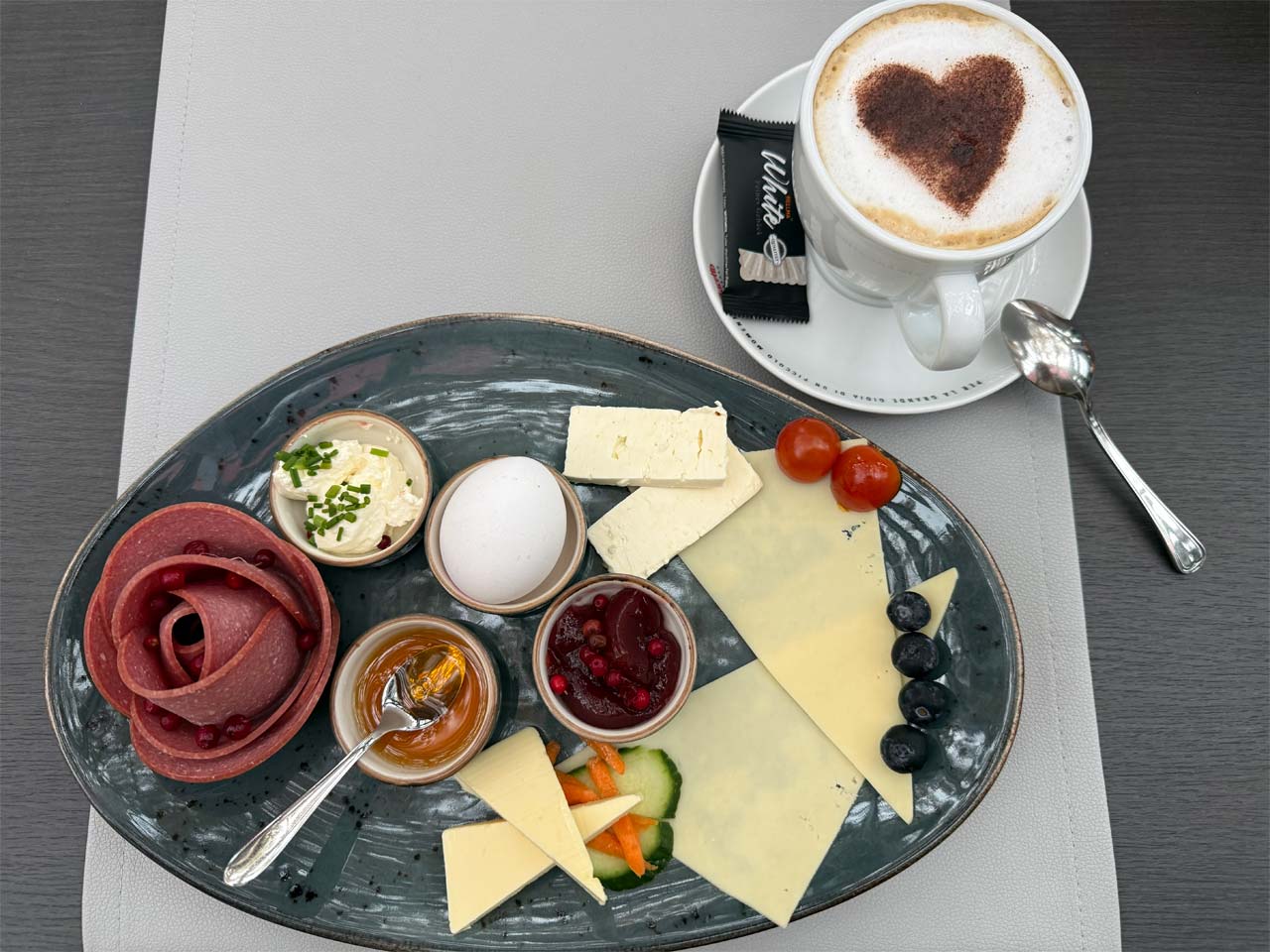 Für unsere Gäste bieten wir einen Frühstücksteller mit zwei Brötchen, Butter, Aufschnitt, Käse, Marmelade, Honig, einem Glas Orangensaft und einem Heißgetränk zum Preis von 17,90 €.